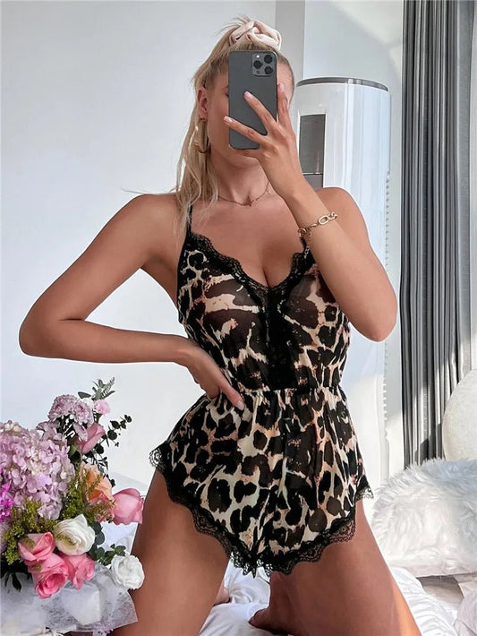 Body de encaje entrecruzado con espalda descubierta para adultos, pelele con estampado completo de malla para dormir, mono con cuello en V, pijama de verano, lencería sexy