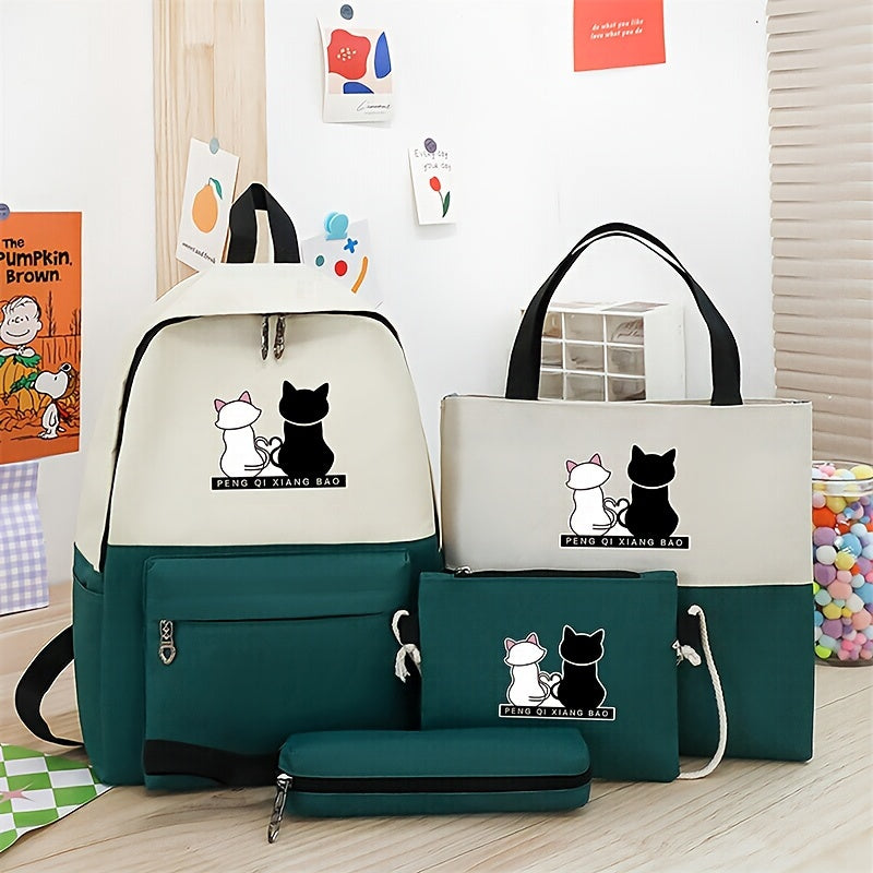 Cartoon Cat Print Contrast Color Backpack With Matching Tote, Pencil Case & Wallet, Durable Travel And School Bag Combo